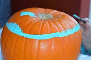 Now for some colour. We painted stripes of paint over the pumpkin using leftover wall paint, though I am sure you could use acrylic paint too.